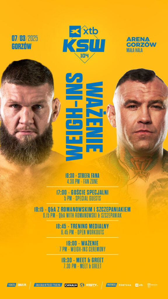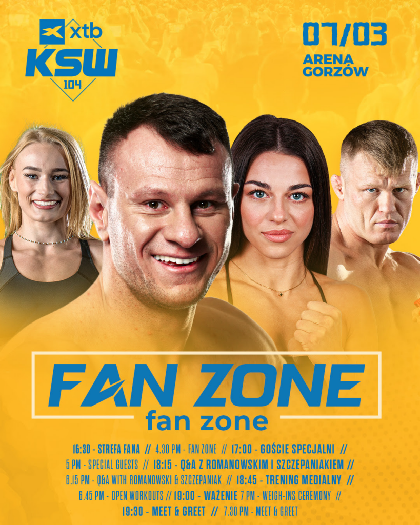 Federacja KSW zaprasza wszystkich fanów oraz media na oficjalną ceremonię ważenia oraz Strefę Fana przed galą XTB KSW 104 w Gorzowie Wielkopolskim. Ważenie odbędzie się w piątek, 7 marca w małej hali Areny Gorzów. Wstęp dla kibiców na to wydarzenie jest wolny. O godzinie 16:30 wystartuje Strefa Fana otwart dla wszystkich fanów KSW, podczas której pojawią się goście specjalni. Do Gorzowa przyjadą między innymi Arek Wrzosek, Wiktoria Czyżewska i Laura Grzyb.