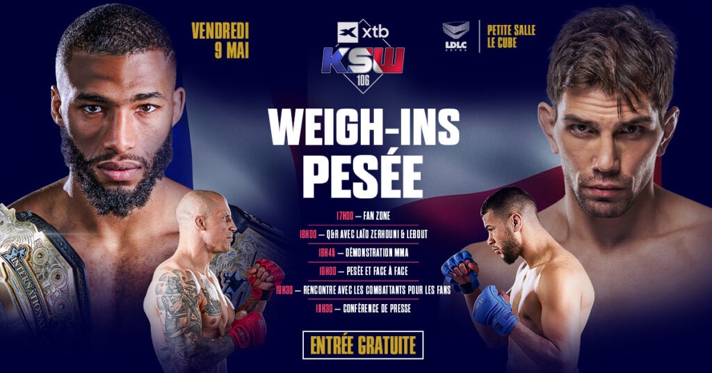 Federacja KSW zaprasza wszystkich fanów oraz media na oficjalną ceremonię ważenia oraz Strefę Fana przed galą XTB KSW 106 w Lyonie. Ważenie odbędzie się w piątek, 9 maja w małej hali LDLC Arena. Wstęp dla kibiców na to wydarzenie jest wolny. O godzinie 17:00 wystartuje Strefa Fana otwarta dla wszystkich fanów KSW.