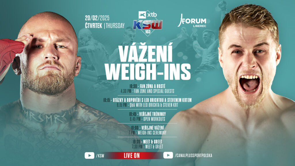 Ważenie odbędzie się w czwartek, 20 lutego w centrum handlowym Forum Liberec. Wstęp dla kibiców na ważenie jest wolny. O godzinie 16:30 wystartuje Strefa Fana otwarta dla wszystkich fanów KSW, podczas której pojawią się goście specjalni w osobach Arkadiusza Wrzoska, Marpo, Tobiasza Le i Viktora Červinský’ego.