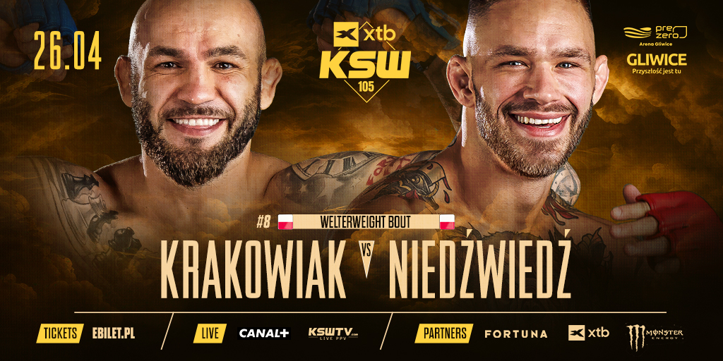 Podczas gali XTB KSW 105 w Gliwicach dojdzie do ekscytującego starcia, w którym numer osiem wśród najlepszych zawodników wagi półśredniej, Marcin Krakowiak (13-5, 5 KO, 6 Sub), zmierzy się z parterowym mistrzem, Adamem Niedźwiedziem (9-4-1, 1 KO, 8 Sub).